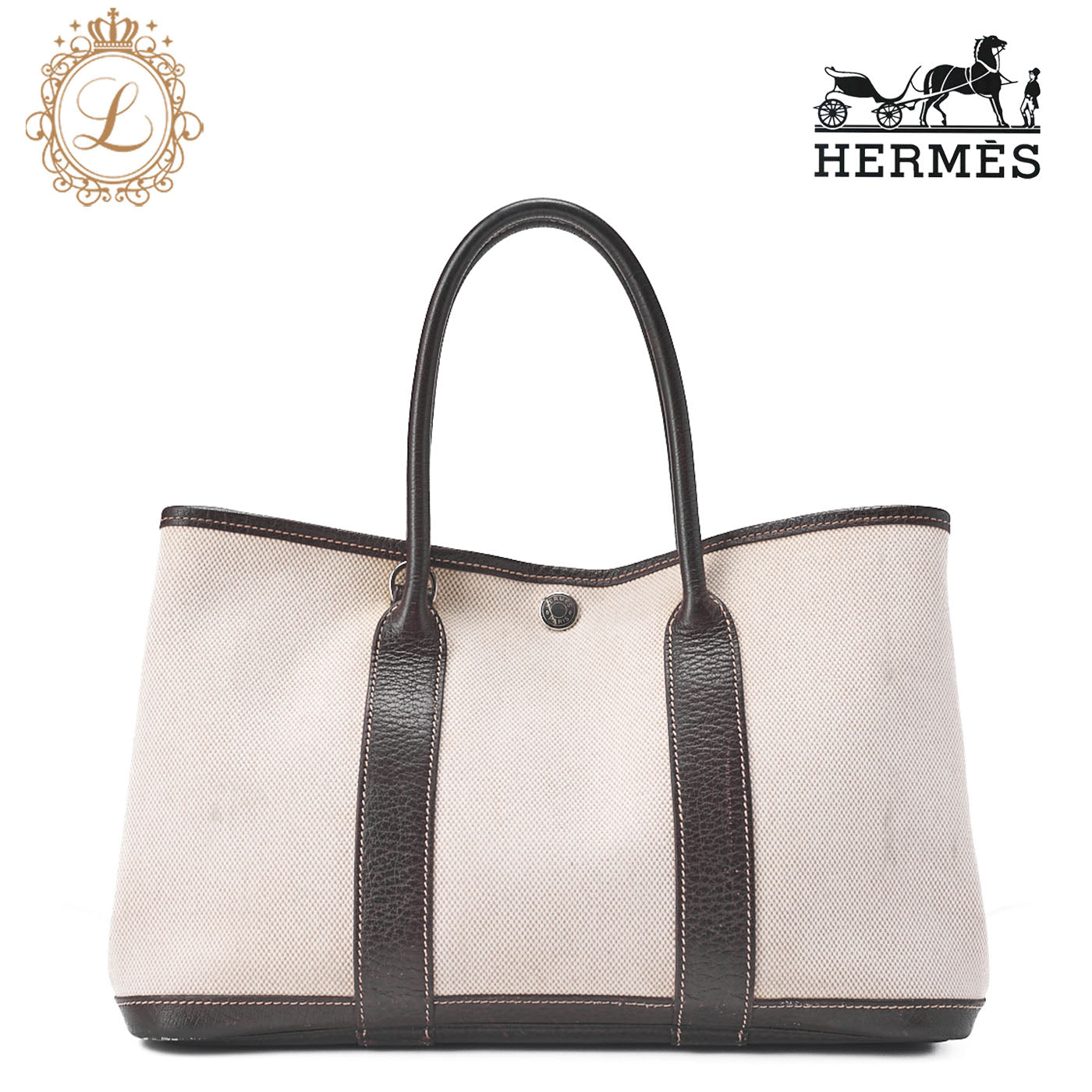 - Iconic design: Authentic Hermes Garden Party TPM bag in ivory and brown with silver-tone hardware.