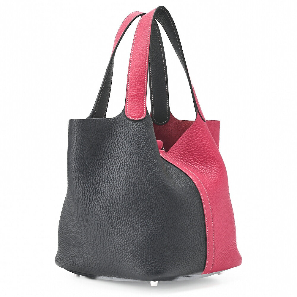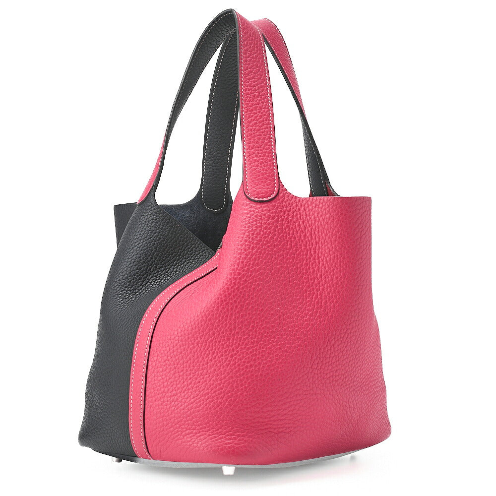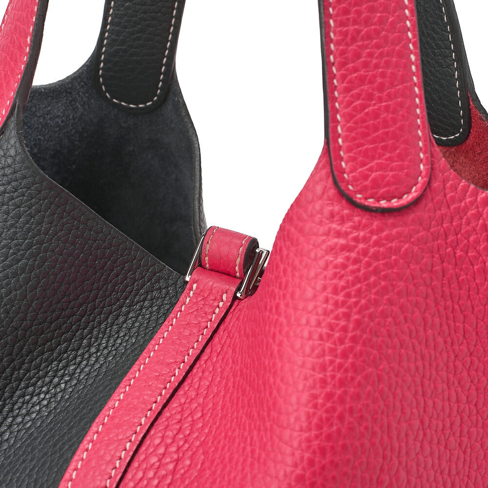 Discover the iconic Hermès Picotin Lock MM bag in two-tone Clemence leather (Brunuit x Framboise) with silver-tone hardware. This pre-owned piece is ideal for those who value timeless luxury with everyday practicality.