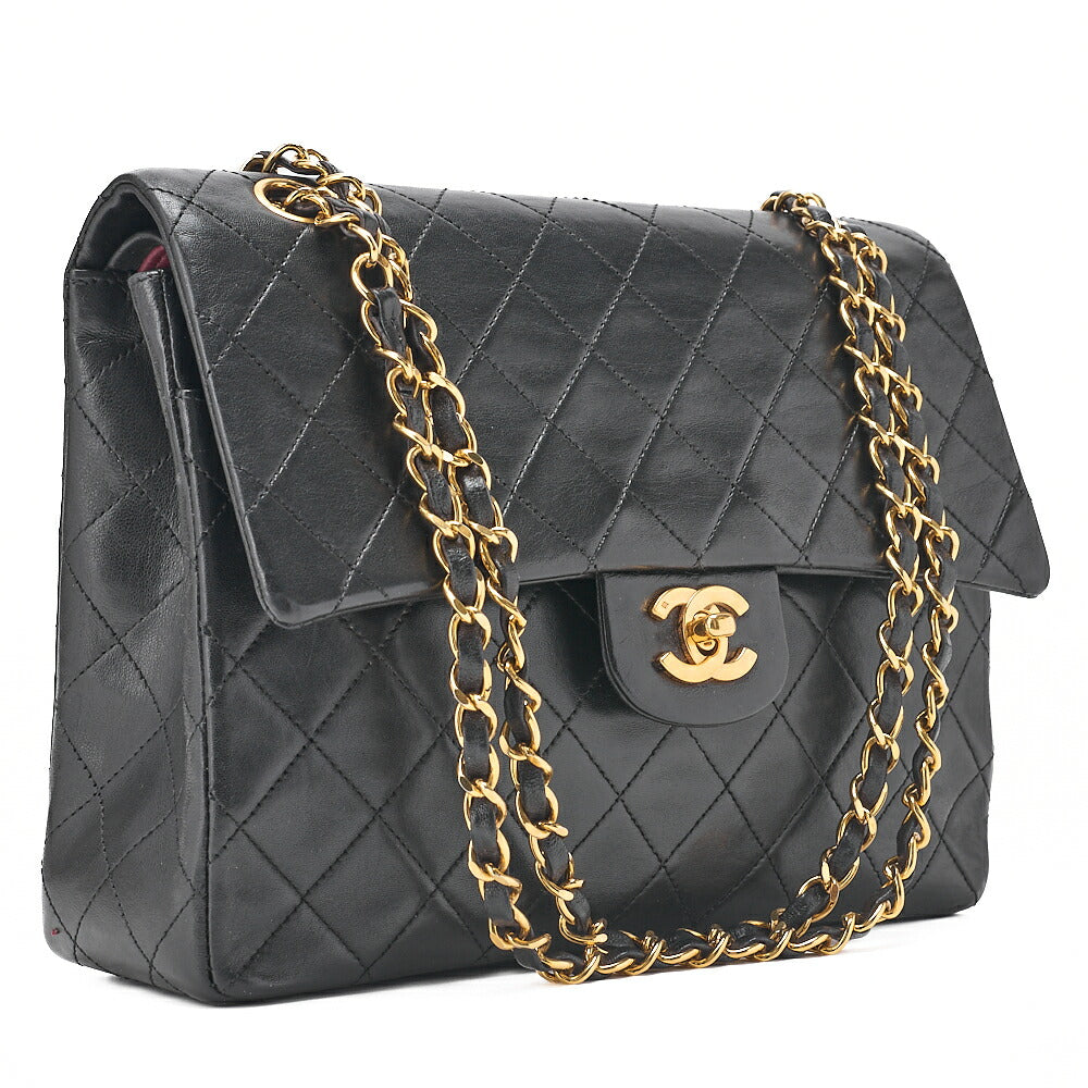 CHANEL Lambskin Matelasse Double Flap 25cm Square Chain Shoulder Black Gold-Tone Hardware, Pre-Owned