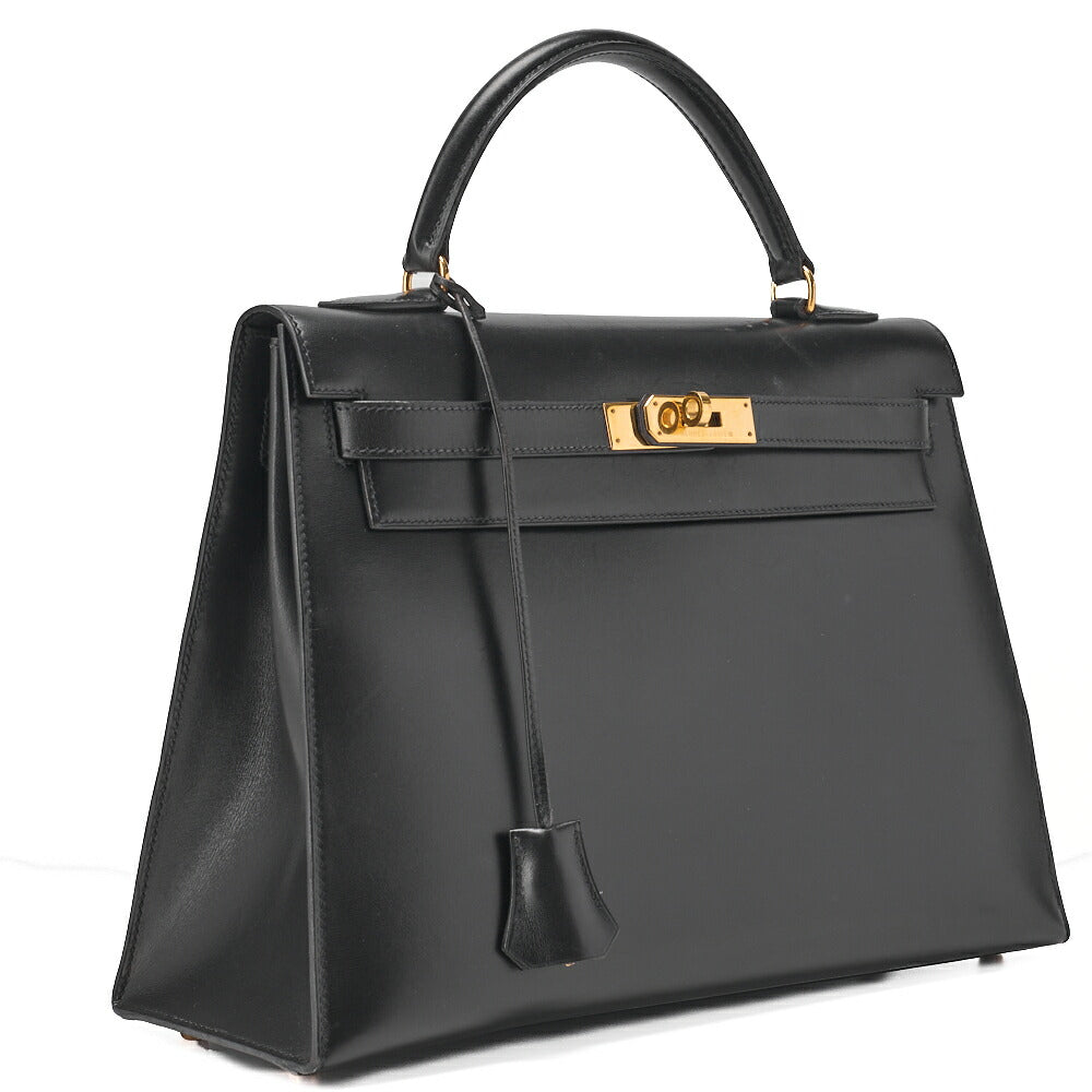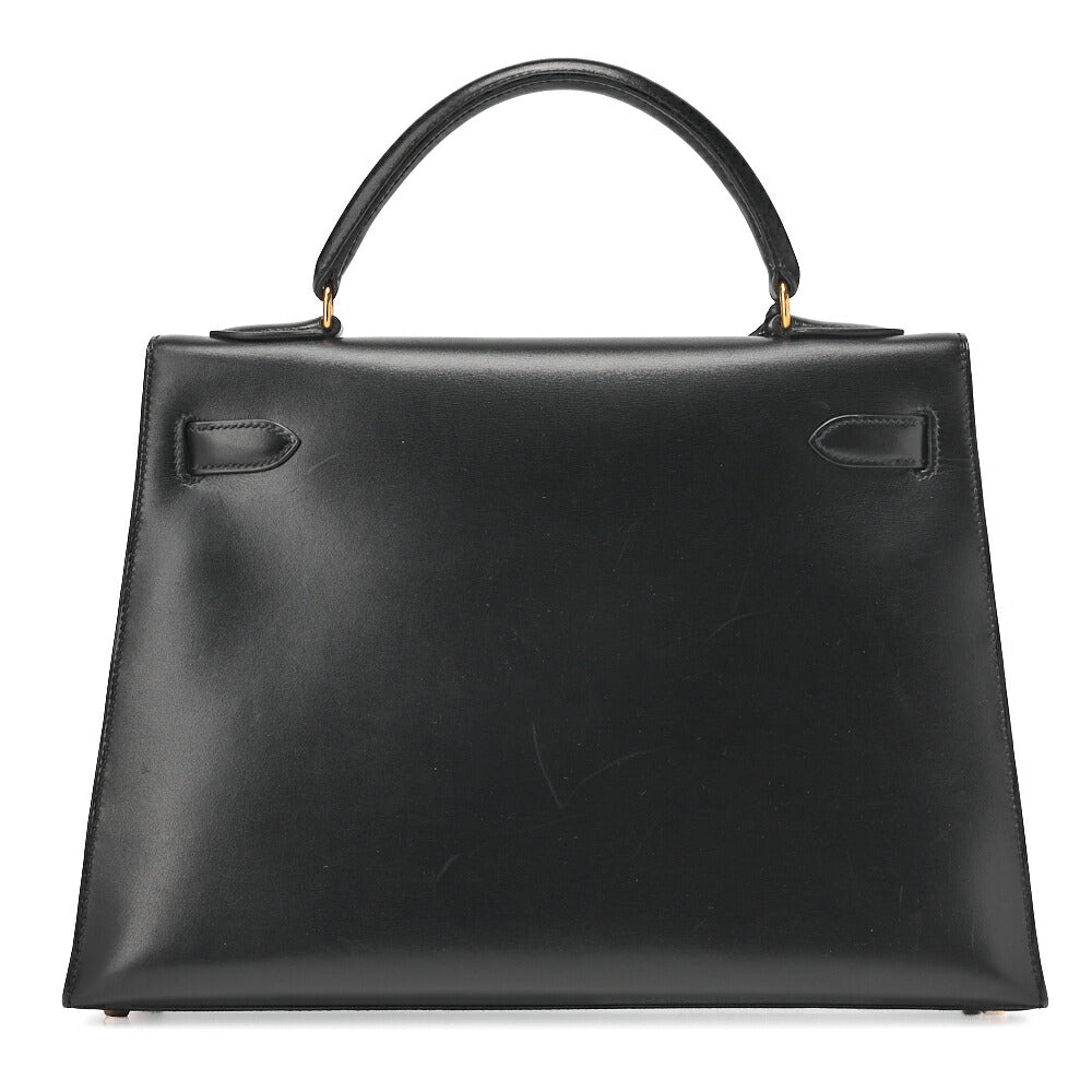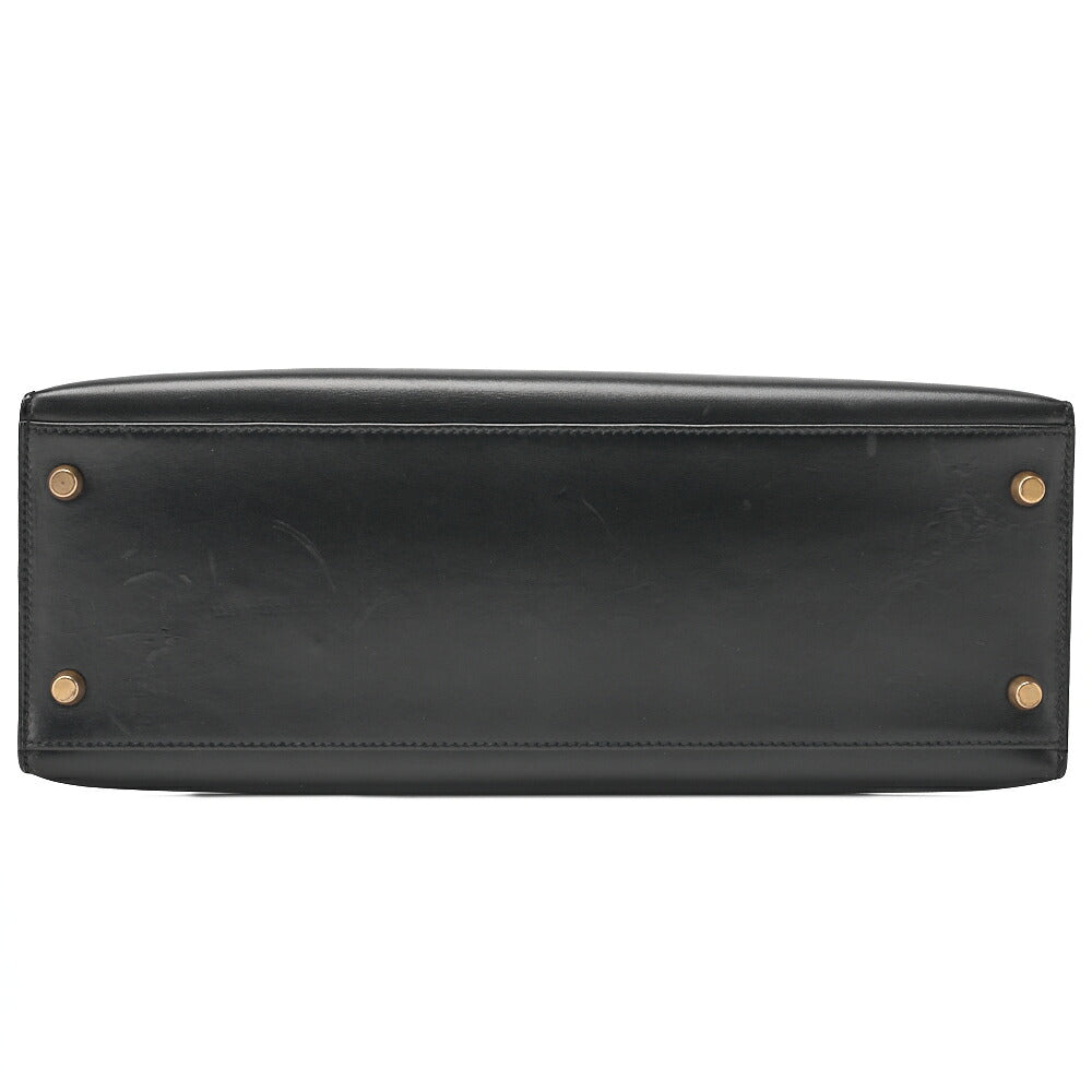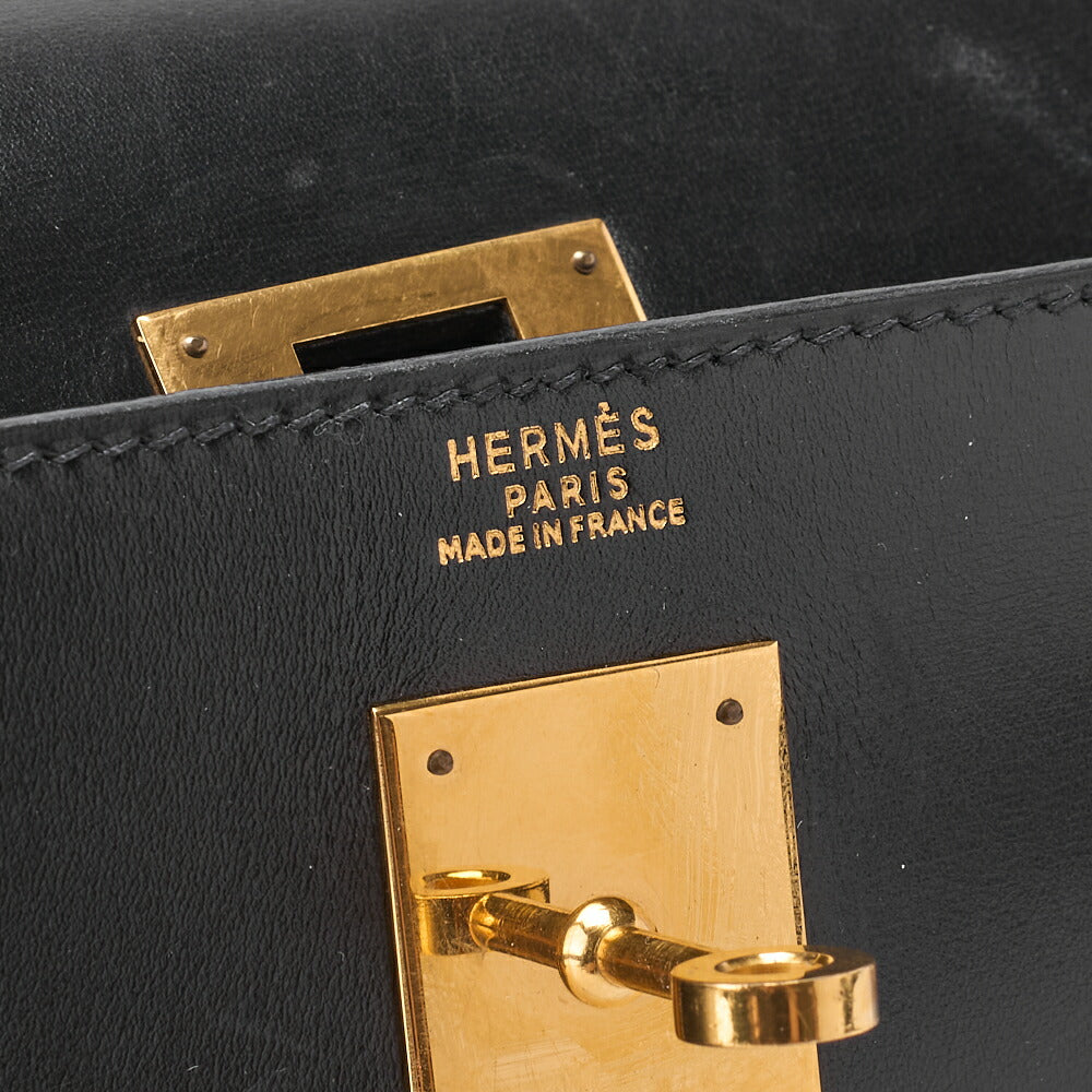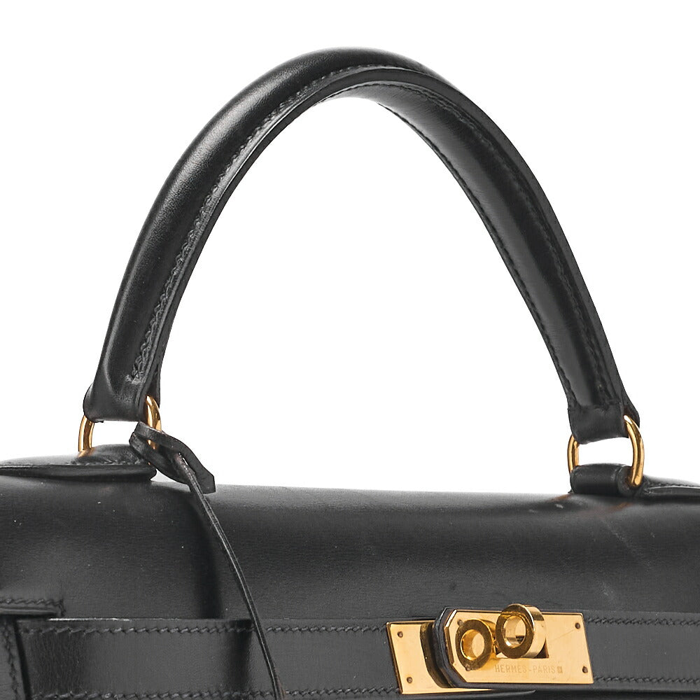 HERMES Kelly 32 Handbag Box Calf Black Black Exterior Stitching Gold-Tone Hardware, Pre-Owned