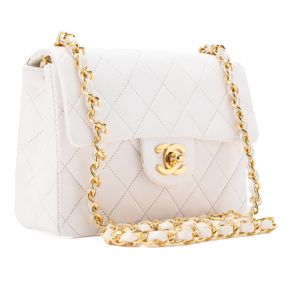 Introducing the CHANEL Chain Shoulder Bag Mini Matelasse by CHANEL, a luxurious accessory designed to elevate your style with its timeless elegance for any occasion. This exquisite bag, crafted from premium lambskin in a stunning white hue, features a sophisticated single flap design with a classic turnlock closure, making it a perfect addition to your collection.