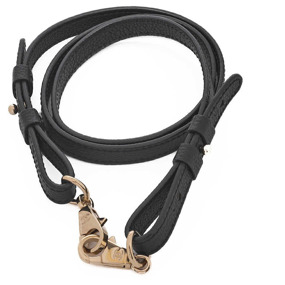 - Material: Caviar leather; Color: Black with Navy trim; Hardware: Gold-tone.